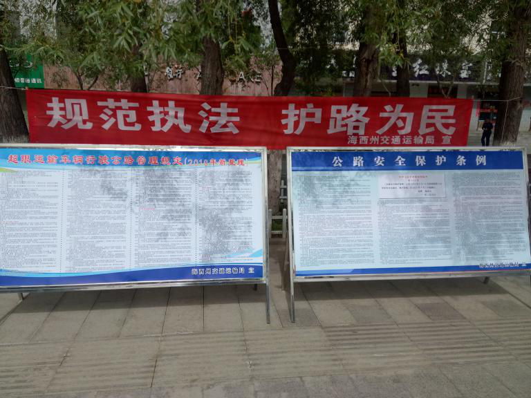 为了认真贯彻落实省交通运输厅关于在全省范围内开展“路政宣传月”集中宣传日活动的部署安排,同时为进一步提升我州人民群众爱路护路意识,增强人民群众的路政法律知识。25日全州各地区交通运政部门、路政部门在各自所辖地区开展集中宣传活动,我局组织州公路运输管理处、德令哈市交通运政部门、路政部门同驻州高速路政执法大队、执法支队,在德令哈市中心广场开展了以“规范执法、护路为民”为主题的集中宣传活动。活动中通过悬挂横幅、制作宣传展板、发放宣传单、治超知识小册子、设置咨询台等形式与群众面对面交流,普及公路法律法规,提高了广大市民对路政管理工作的认识和理解。此次活动共参加宣传人员50余人、悬挂宣传标语15条、语音播放器3个、横幅10条,制作展板12块、印发宣传单4000余份,接受群众咨询600余人次。